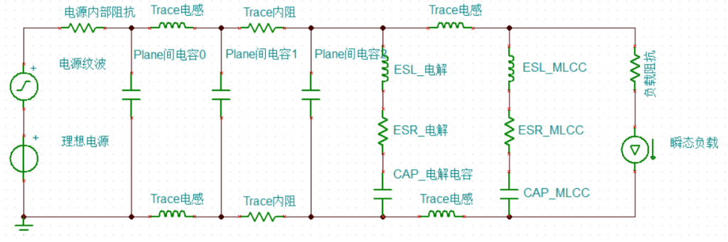 和高中的干电池加开关加一个纯阻性的小灯泡有很大不同。不难发现,电源的内阻变成了内部阻抗,还多了一个纹波电压。负载也变成了一个非恒定负载,并且具有一定的阻抗。电容也多了两种,具有ESL(等效寄生电感)和ESR(等效寄生电容)的电解电容和MLCC,