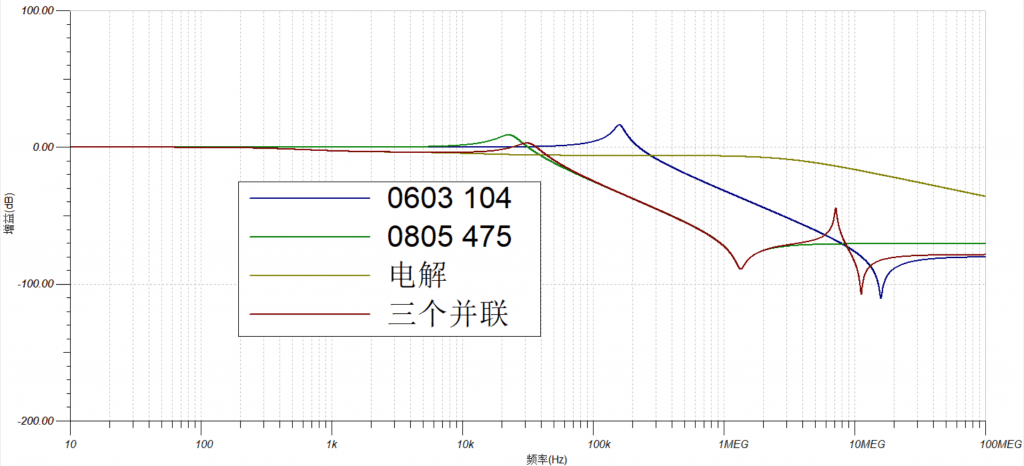 简单做了个仿真,三种典型的电容(想一想,为什么没必要写电解电容的具体参数?)的滤波效果。这是一个非常粗略的仿真,但是足以说明问题,仔细观察下图,联想不同电容的寄生参数,找到规律,如果你能用基本的电分知识推导出来,那就更好了。